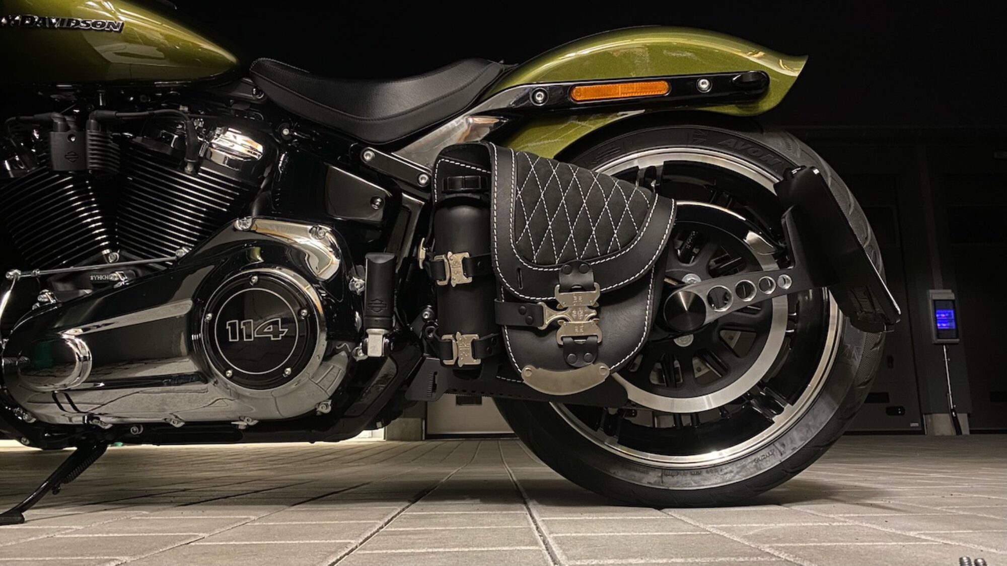 The swing arm bag with bottle holder, suitable for all Harley-Davidson® Softail models from model year 2018, is handcrafted from 3-4 mm thick and carefully selected leather.